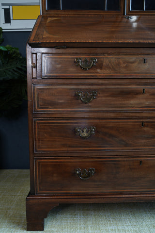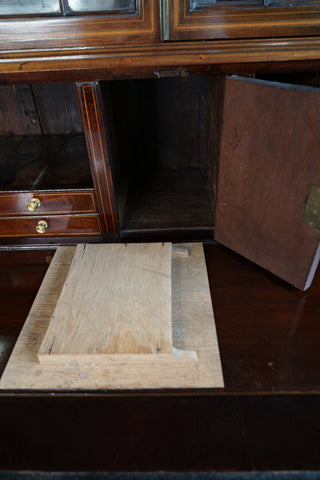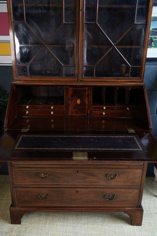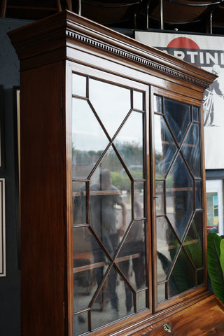 The upper bookcase features glazed doors with delicate astragal glazing bars, perfect for displaying books or cherished objects. The lower fall-front bureau opens to reveal a fitted interior with small drawers and pigeonholes — designed for writing, correspondence, and organization.