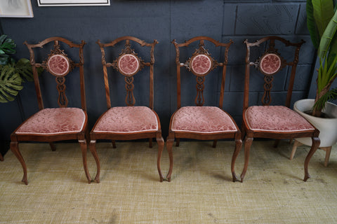 Set of 4 Victorian Walnut Dining Chairs — Hand-Carved Elegance with Light Salmon Upholstery