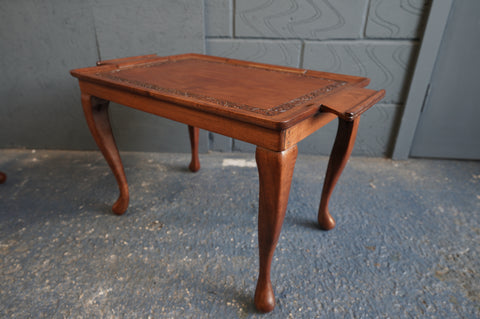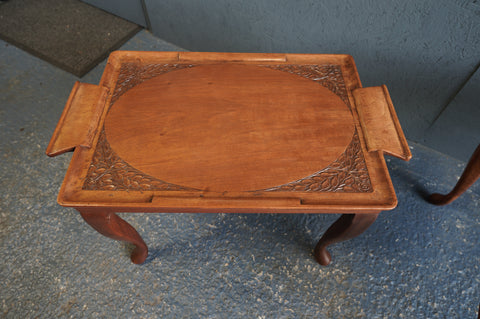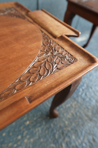 These are not merely tables; they are a study in the "Old World" habit of service and adaptability. You are viewing a rare "Harlequin Pair"—two distinct but spiritually connected tables from the Queen Anne Revival period (circa 1920s). Both feature the highly desirable "Butler’s Tray" silhouette, with raised gallery edges originally designed to prevent crystal decanters from sliding off during service.