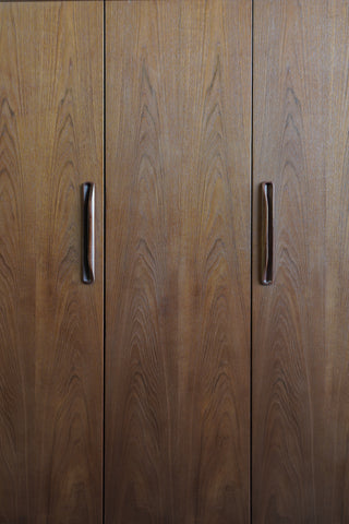 A monolith of British Mid-Century Modern design. Designed by Victor Wilkins for G-Plan, this "Fresco" wardrobe is defined by its vibrant Teak veneers. The doors display G-Plan's obsession with grain selection—look for the "Cathedral" (arch-shaped) figuring that runs symmetrically across the front. The rich, honey-toned teak is contrasted by the darker, sculpted Afromosia handles, which are shaped to fit the hand perfectly.
