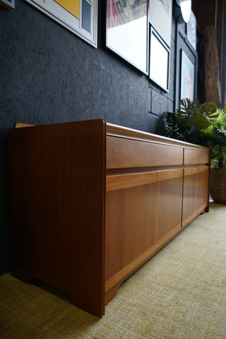 Design Style / Period: A classic mid-century modern design from the 1960s–70s, characterized by its minimalist aesthetic, recessed handles, and seamless symmetry. The restrained form allows the natural beauty of the wood to take centre stage.