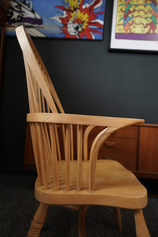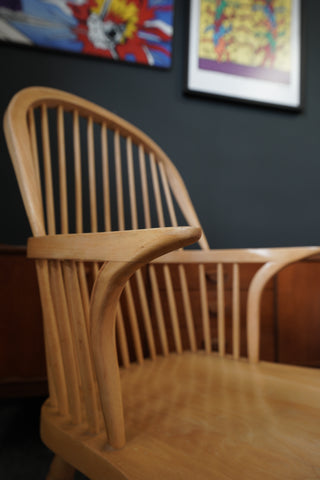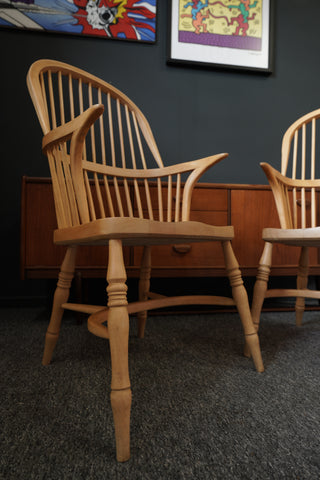 This exquisite pair of British Windsor carver armchairs embodies timeless country elegance. Crafted from lustrous solid beech, each chair showcases a beautifully sculpted bow-back design with gracefully turned spindles, creating an open and inviting silhouette. The wide, shaped seats offer ergonomic comfort, subtly contoured to enhance the user experience. Complementing the back, the arms flow seamlessly, culminating in delicate scrolls that add a touch of refined craftsmanship. The chairs stand on elegantly turned legs, connected by sturdy H-stretchers, promising both stability and aesthetic appeal. The light, warm tone of the beech wood, with its fine, even grain, brings a natural brightness to any interior.