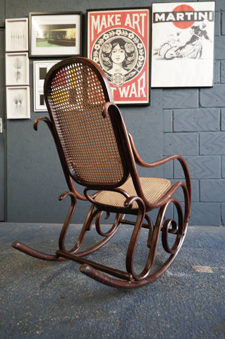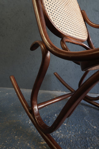 A genuine Mid-Century Revival classic. This rocking chair bears the original P.I. Dinette maker's mark, identifying it as a verified vintage piece from the 1970s. It features the iconic "Schaukelstuhl" silhouette: a continuous, fluid loop of steam-bent Beech timber stained to a deep Walnut tone. The frame supports airy, hand-woven rattan (cane) panels, creating a design that is visually light yet structurally robust. The "P.I. Dinette" label is significant. It links this piece to the major mid-century importation of high-quality bentwood furniture from the historic ZPM Radomsko factories in Poland (formerly owned by Thonet). It represents the bridge between 19th-century craft and 1970s bohemian style.