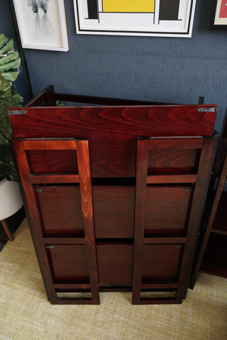 A striking set of mid-century collapsible shelving units, combining sculptural simplicity with smart functionality. Crafted in rich, dark-stained wood, these elegant pieces embody the minimalist aesthetic and practicality of Scandinavian modern design from the 1950s–60s.