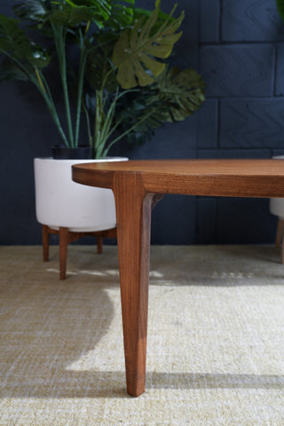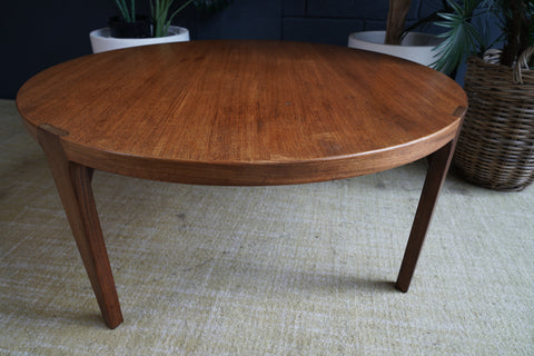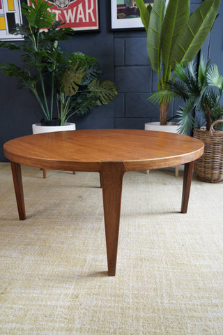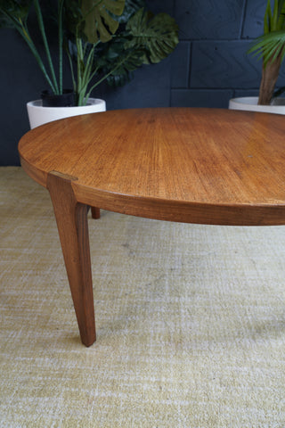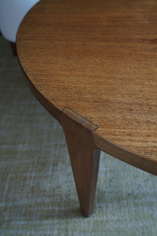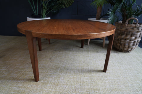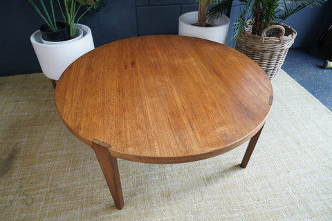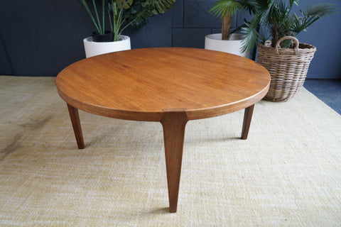 A beautifully proportioned Danish teak round coffee table, showcasing the refined craftsmanship and minimalist design that define Scandinavian mid-century style. Its timeless silhouette and rich teak tones make it an effortless addition to any modern or vintage-inspired interior.